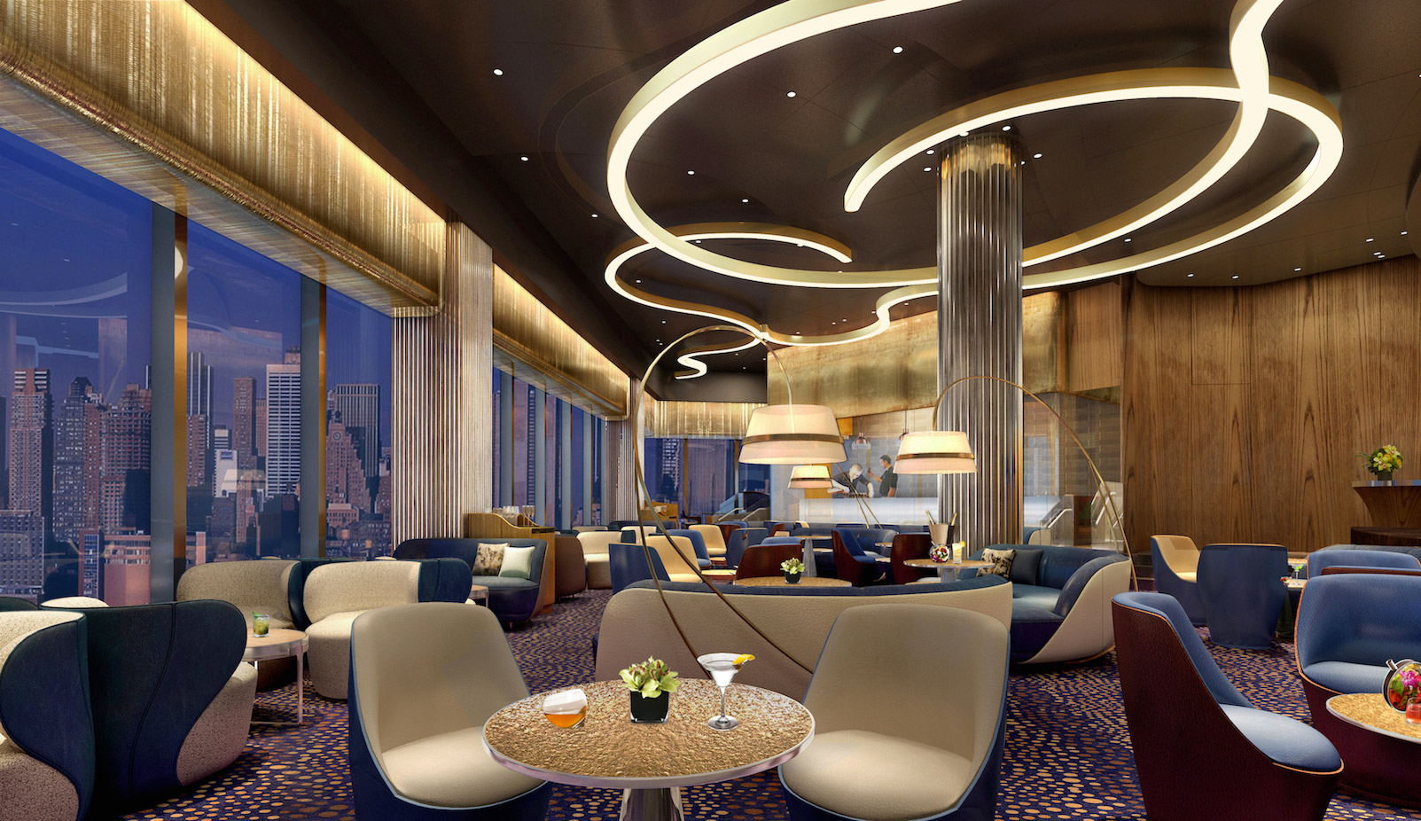 Sweeping custom floor lamps will brighten the lounge, while overhead, curving, ribbon-like gold light fixtures will weave across the dark ceiling. A custom dark blue Loloey carpet, featuring playful swirls of white, beige and tan tones, will adorn the space throughout, providing a dramatic contrast to the gold mesh-framed wall of windows with panoramic views of the city.